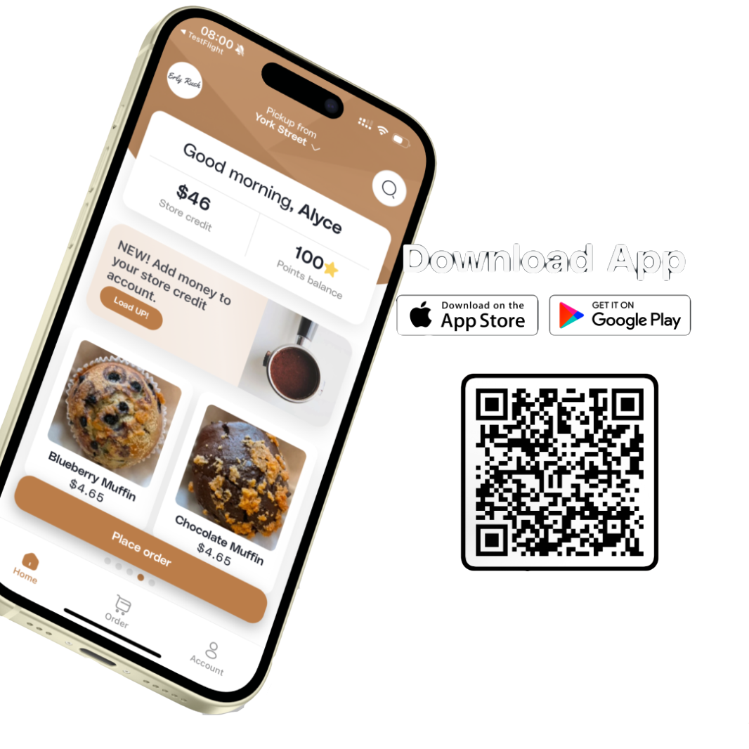 Go to either the App Store or Google Play store and download the Erly Rush App. Once download slide through all the different selections we have!